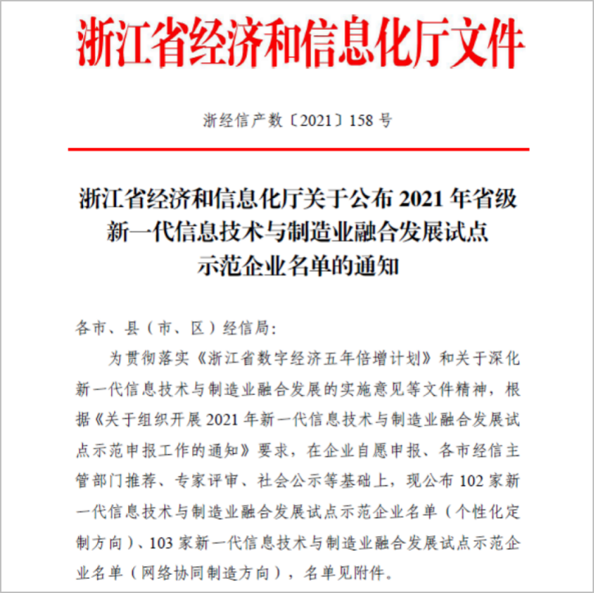 近日,省经信厅公布2021年省级新一代信息技术与制造业融合发展试点示范企业名单的通知,该名单包含了个性化定制和网络协同制造等2个方向,华康股份以网络协同制造方向入选。